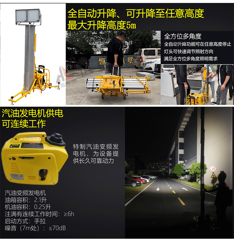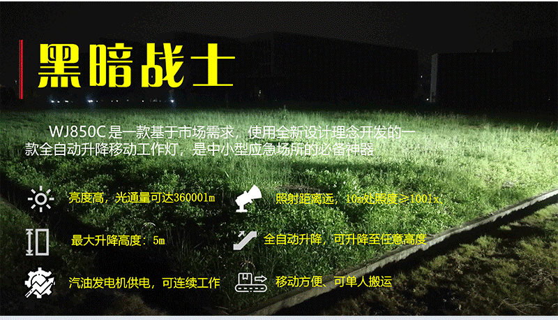 聯(lián)系人:劉經(jīng)理經(jīng)過我們恒盛照明對市場的用戶需求調(diào)查了解到,一些工礦企業(yè),消防單位,防汛現(xiàn)場,搜救現(xiàn)場,夜間施工等行業(yè),在夜間工作時有時候會遇到燈具取電照明困難等問題,而且一般的燈具無法滿足其照射高度和照射亮度的需求,根據(jù)這些用戶的反饋,我公司設(shè)計部經(jīng)過大膽的設(shè)想,把發(fā)動機、燈具和升降桿組合在一起,形成了WJ850C的雛形,經(jīng)過我們現(xiàn)場實際使用不斷的測試,讓其更加方便使用經(jīng)過反復的測試修改,就是今天我們介紹的產(chǎn)品黑暗戰(zhàn)士WJ850C,從此不懼黑暗,夜如白晝。