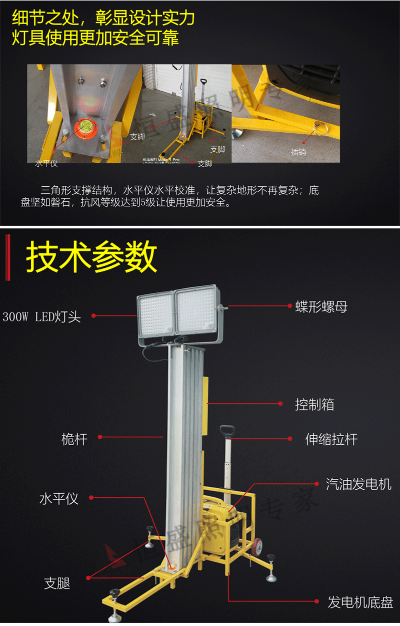 細節(jié)之處彰顯設(shè)計實力,燈具使用更加安全可靠。三角形支撐結(jié)構(gòu),水平儀水平校準,讓復雜地形不再復雜;底盤堅如磐石。抗風等級達到7級讓使用更加安全。