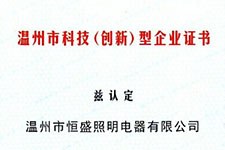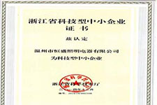 繼獲得溫州市科技企業(yè)榮譽(yù)之后,恒盛照明一鼓作氣拿下了《浙江省科技型中小企業(yè)》殊榮。頒證時(shí)間為2014年12月,編號(hào)為:20143303002108。 這塊...