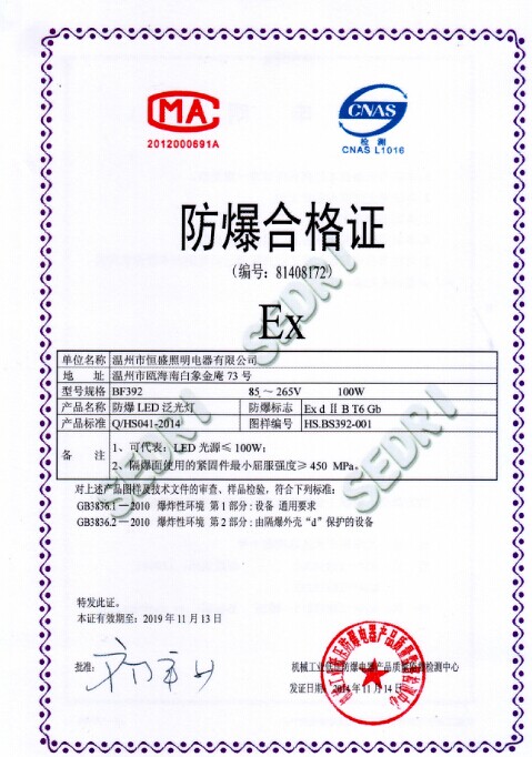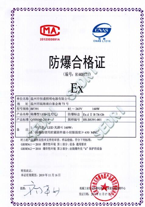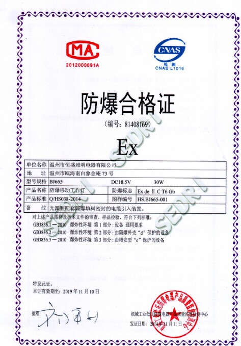 更多防爆合格證可以通過聯系恒盛照明公司查詢了解,公司始終以品質為第一,努力打造防爆移動工作燈、佩戴式防爆強光照明燈、節能防爆強光電筒、防爆LED泛光燈等為主的防爆燈具生產基地。