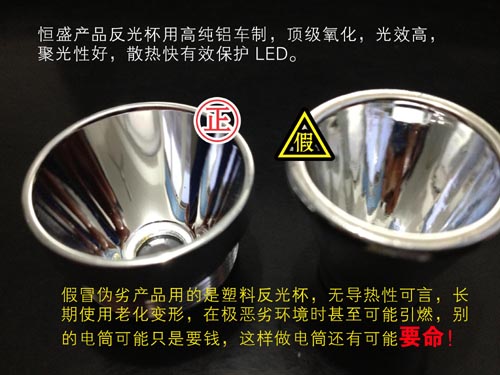 恒盛牌JW7623|JW7620佩戴式強(qiáng)光照明燈反光杯是經(jīng)過權(quán)威的配光研究所進(jìn)行配光,并用鋁車制確保配光的準(zhǔn)確性及導(dǎo)熱性,使LED壽命及反光杯日久彌新。而假冒恒盛牌JW7623|JW7620佩戴式強(qiáng)光照明燈則大膽的使用了塑料的電鍍一層膜來坑騙用戶,這種反光杯不僅沒有進(jìn)行專業(yè)的配光,短期內(nèi)使用即可能泛黃,泛黑。致使的弱點(diǎn)是,如果長(zhǎng)時(shí)間使用燈具產(chǎn)品有可能引起變形甚至燃燒。