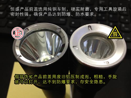 恒盛牌JW7623|JW7620佩戴式強(qiáng)光照明燈前蓋用純銅車制而成,使燈具在高空跌落也不會(huì)變形,可以正常使用,并需要有專用工具開蓋或合蓋,達(dá)到防爆要求。而假冒偽劣JW7620佩戴式強(qiáng)光照明燈| JW7623多功能強(qiáng)光巡檢工作燈僅采用一個(gè)鋁壓制的前蓋,手旋都可以打開,安全性能堪憂。