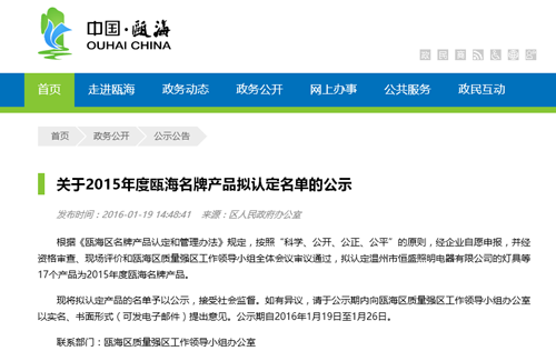 甌海區(qū)人民政府網(wǎng)站最近發(fā)布公告稱:根據(jù)《甌海區(qū)名牌產(chǎn)品認定和管理辦法》規(guī)定,按照“科學、公開、公正、公平”的原則,經(jīng)企業(yè)自愿申報,并經(jīng)資格審查、現(xiàn)場評價和甌海區(qū)質(zhì)量強區(qū)工作領導小組全體會議審議通過,擬認定溫州市恒盛照明電器有限公司的燈具等17個產(chǎn)品為2015年度甌海名牌產(chǎn)品。此次同步進入的同行還有浙江正輝照明工程有限公司及浙江森馬企業(yè)等知名企業(yè)。