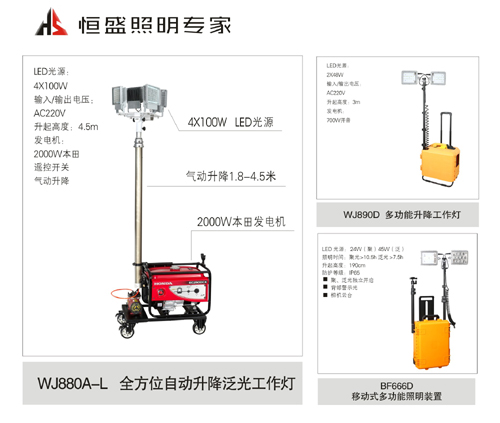 1、從上面上市產品列表不難發現,2016新產品的特點除了LED外還是LED。比如LED款全方位自動升降泛光工作燈(WJ880A-L),LED車載遙控探照燈(WJ828D)這兩款產品傳統光源都是選用氙氣,鹵鎢燈,金鹵燈,鈉燈等光源。恒盛照明企業在LED應用到爐火純青階段全部更新為LED光源。經過現場測試,同等條件下LED光源完勝鹵鎢燈光源。