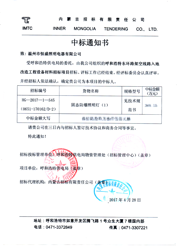 此次內蒙古呼和浩特電業局在改造工程中用到一批固態防爆照明燈,進行了公開招標,恒盛照明企業披荊斬棘突破重圍,拿到這個標段的中標通知書。
